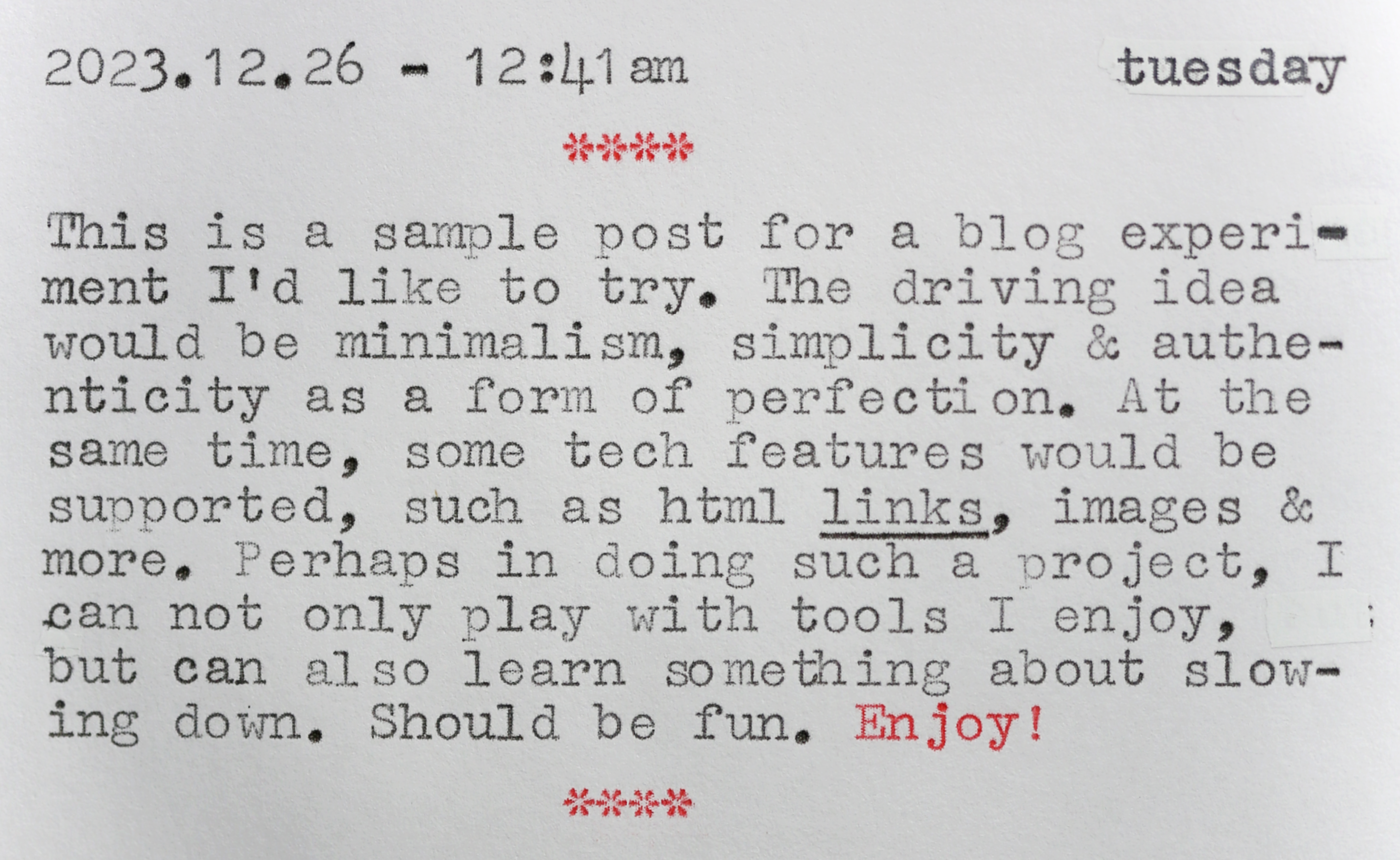 In a way, writing with a typewriter is extremely simple and very honest. Simple because there is just a writer, a machine, and a piece of paper. Honest, because you cannot go back, you cannot hide the past. (Sure, you can block your mistake with whiteout, but we know you did.)