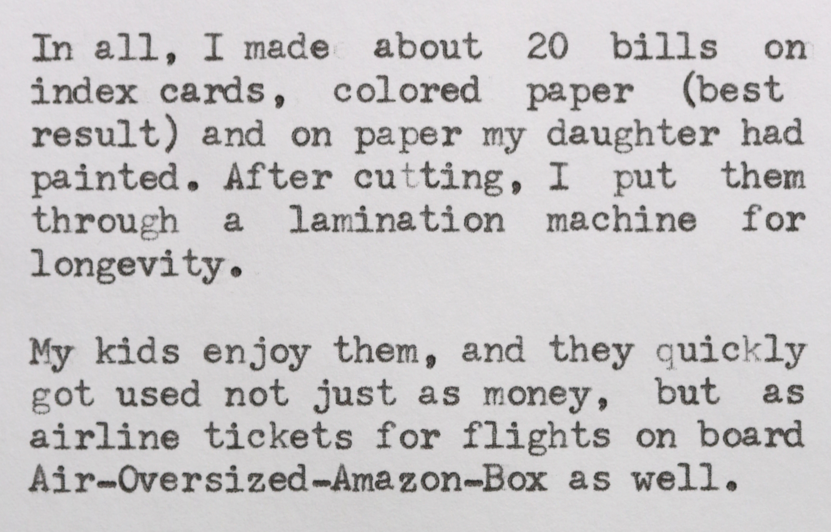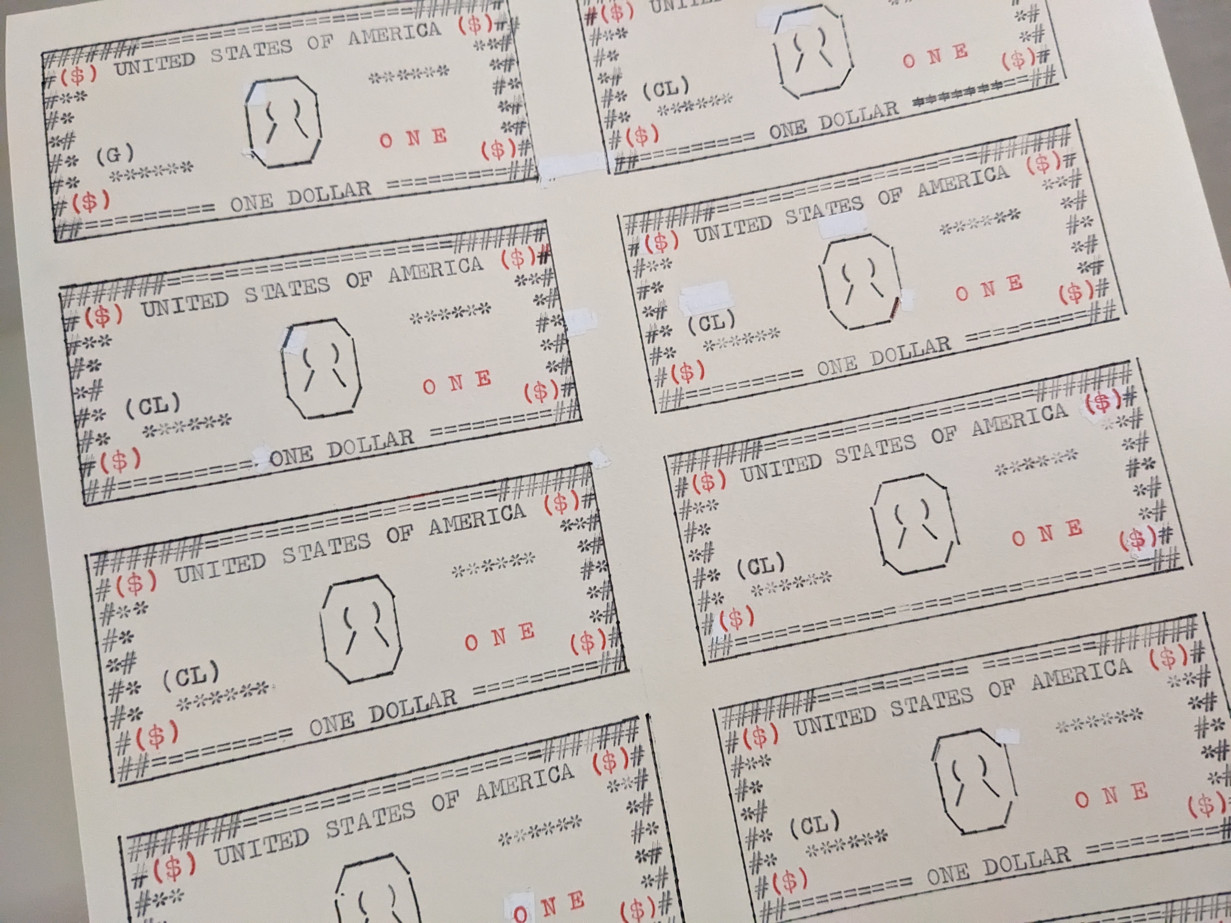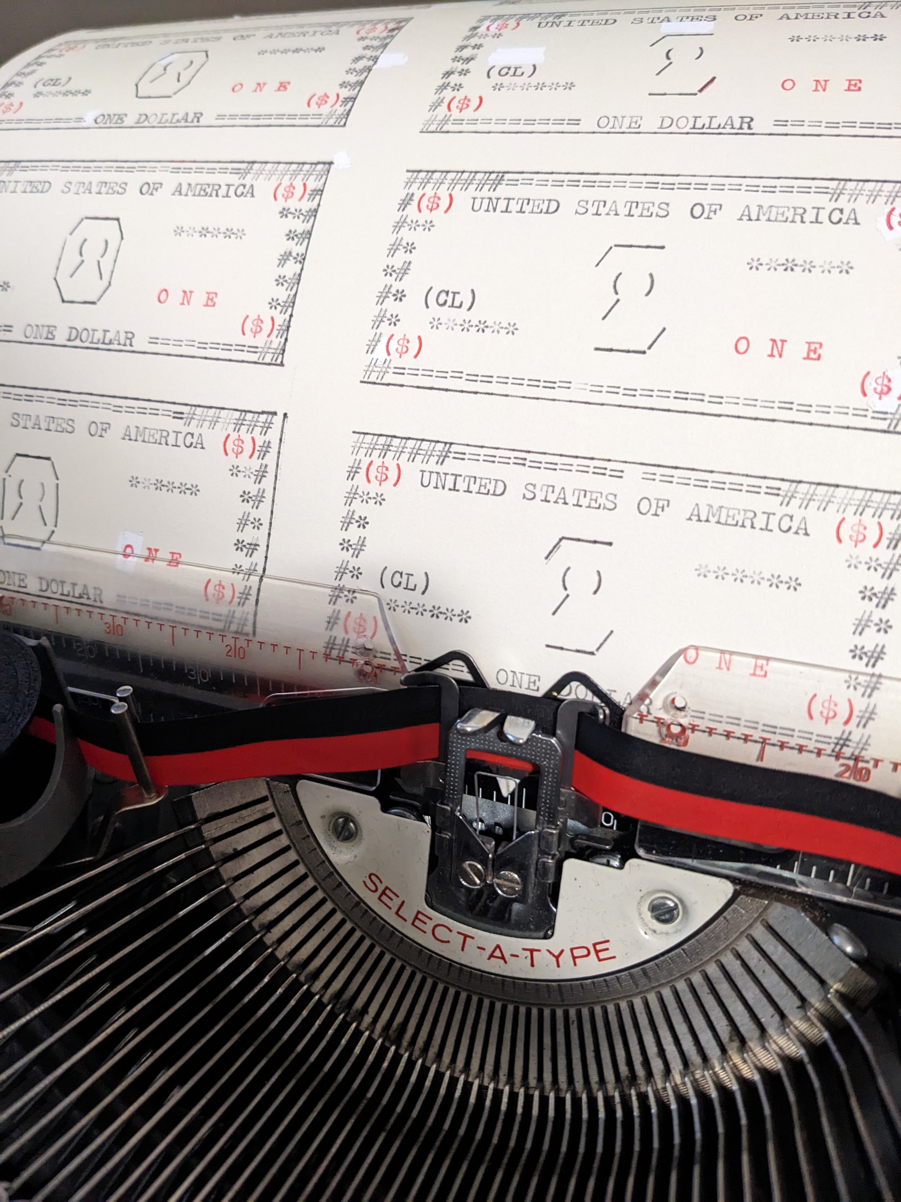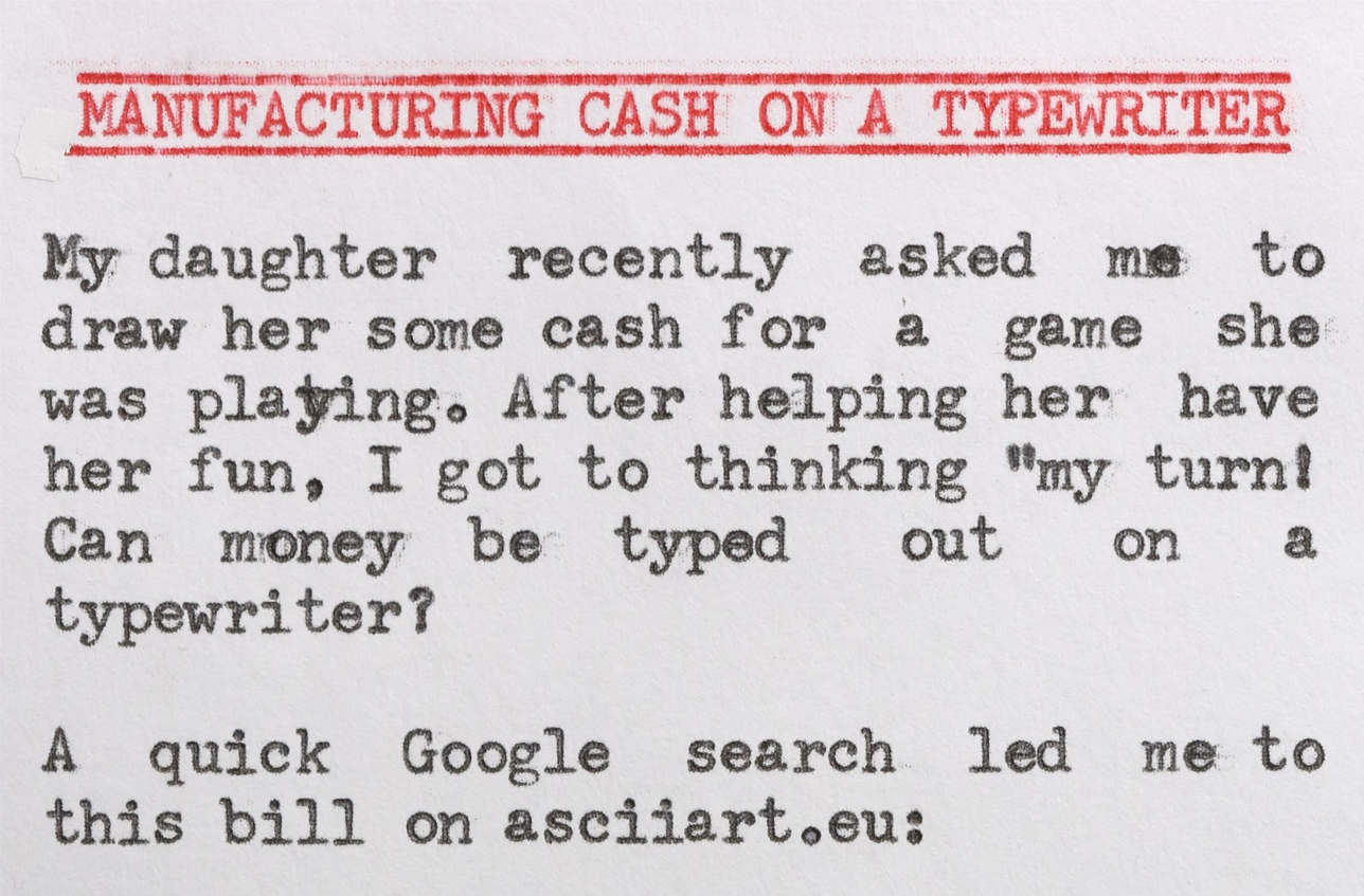My daughter recently asked me to draw her some cash for a game she was playing. After helping her have her fun, I got to thinking "my turn! Can money be typed out on a typewriter?"