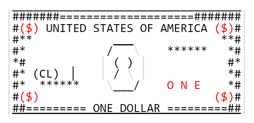 __________________________________ |#######====================#######| |#($) UNITED STATES OF AMERICA ($)#| |#** **#| |#* / \ ****** *#| |*# | ( ) | #*| |#* (CL) | / \ | *#| |#* ****** \___/ O N E *#| |#($) ($)#| |##========= ONE DOLLAR =========##| __________________________________