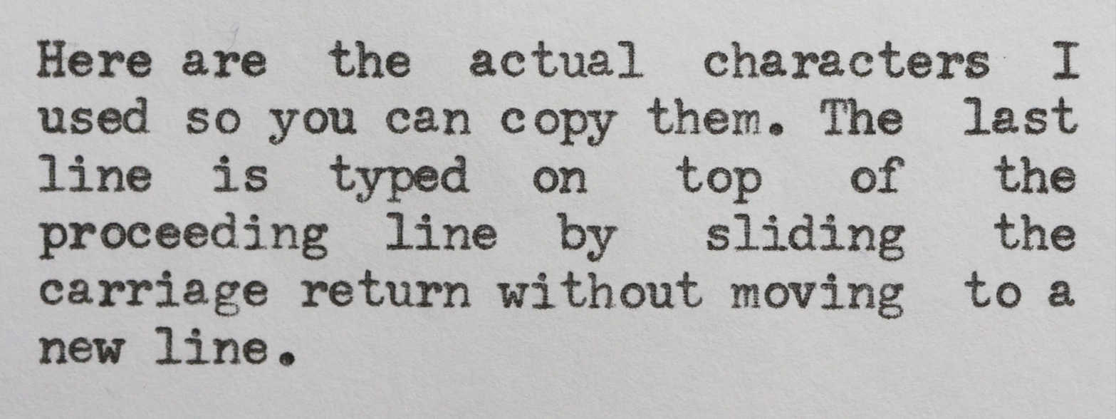 Here are the actual characters I used so you can copy them. The last line is typed on top of the proceeding line by sliding the carriage return without moving to a new line.