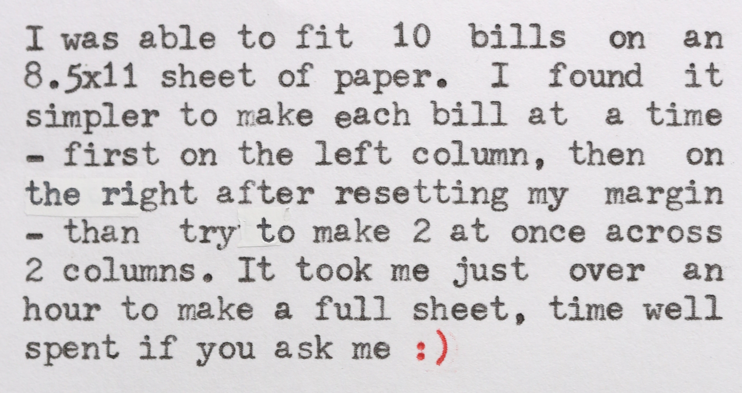 I was able to fit 10 bills on an 8.5x11 sheet of paper. I found it simpler to make each bill at a time - first on the list column, then on the right after resetting my margin - than try to make 2 at once across 2 columns. It took me just over an hour to make a full sheet, time well spent if you ask me :)