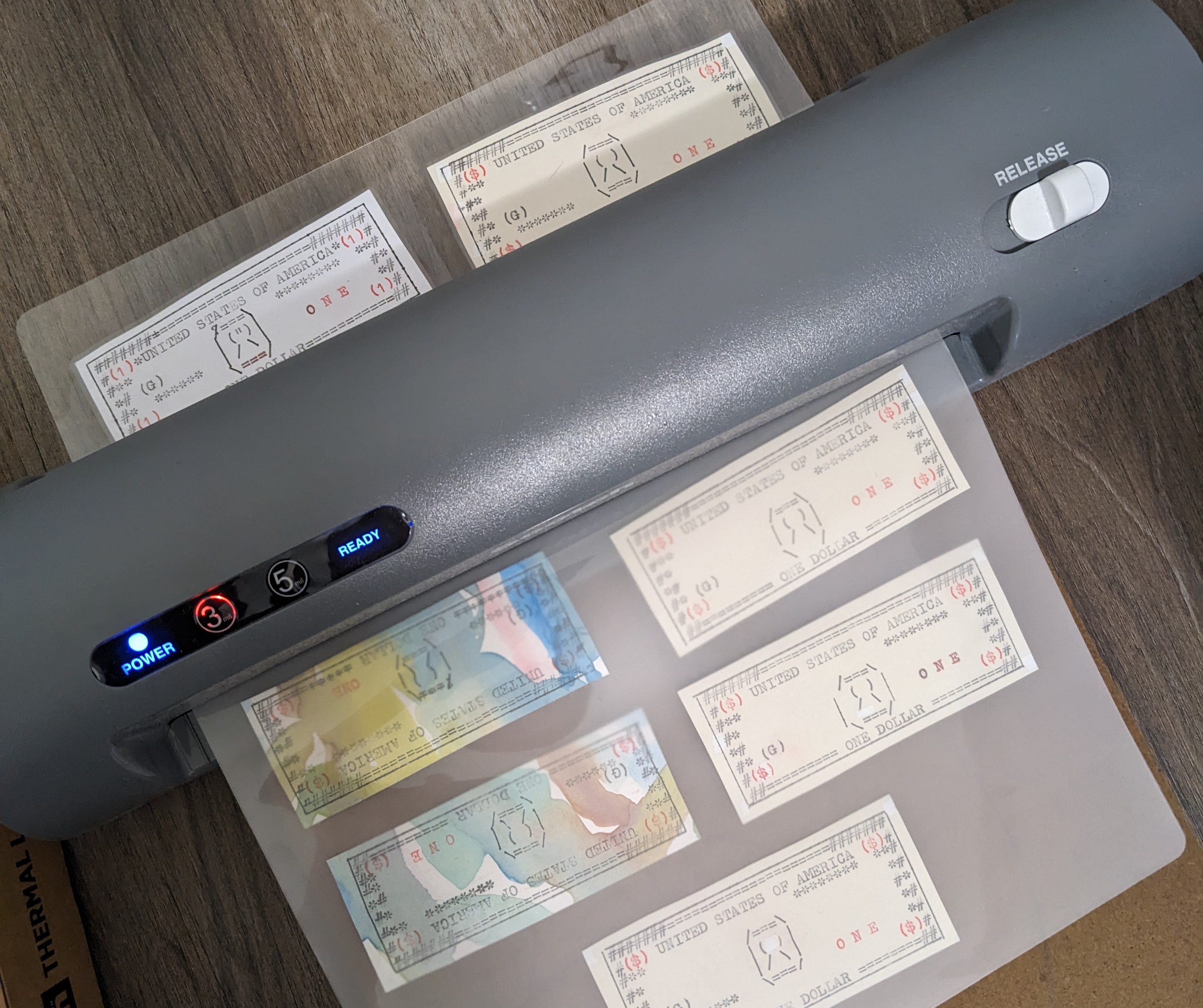 In all, I made about 20 bills on index cards, colored paper (best result) and on paper my daughter had painted. After cutting, I put them through a lamination machine for longevity.
