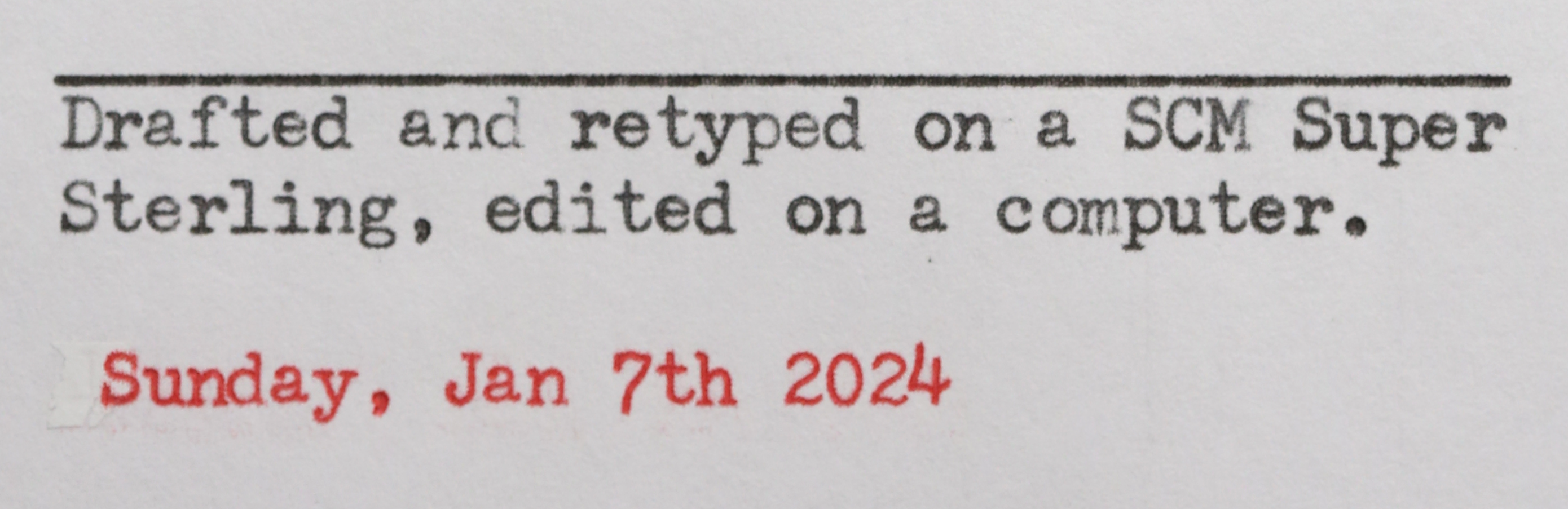Drafted and retyped on a SCM Super Sterling, edited on a computer.